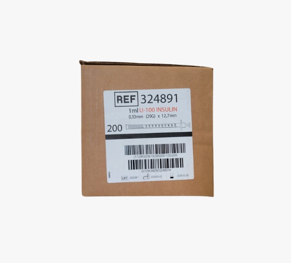 BD Insulin needles and syringes manufactured by BD. Gauge 0.33 mm (29 G). Needle length is 12.7mm.
